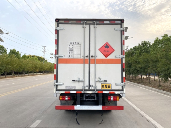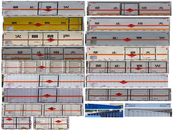 1、復合板工藝:嚴格按照公告尺寸制作。外板采用優(yōu)質(zhì)烤漆板(顏色可選:白,灰,檸檬黃)帶百葉窗,內(nèi)飾為導電性能良好的鋁平板有透氣孔,矩形骨架結構內(nèi)部填充防火阻燃材料,復合加鉚合工藝。廂體四周鋁合金包邊及包角,車廂底板鋪設防靜電膠皮,廂體前臉50公分高鋪設防靜電膠皮。后部設置對開門,右側單開門,廂體內(nèi)部兩側安裝捆綁貨物的臥環(huán)。廂體內(nèi)部安裝煙霧報警器,門上安裝防盜報警器。車廂一周粘貼橙色反光帶,箱體粘貼菱形標志牌,安全告示牌,危險品牌,箱體安裝示廓燈(前白后紅),拖地靜電帶。