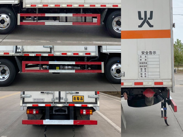 其它 | 1、該車為危險品運輸車.運輸具有獨立容器(瓶)包裝的易燃液體物品.運送危險物品類項號:3類.廂體頂部封閉不可開啟.2、側,后防護材料均為Q235,側防護螺栓連接,后防護焊接,截面尺寸(mm):100×50,下邊緣離地高430mm.3、整備質(zhì)量含備胎,滅火器及隨車工具;貨廂重量為1090kg;材質(zhì)/厚度:復合板結構廂體:底板材質(zhì)為Q235,厚度3mm,側板為外Q235+中間阻燃泡沫+內(nèi)純鋁板,厚度42mm;瓦楞板結構廂體:底板材質(zhì)為Q235,厚度3mm,側板為Q235,厚度1.5mm.4、僅選用排氣管前置、限速裝置(限速80km/h)、前輪盤式制動及子午線輪胎的底盤,轉(zhuǎn)向輪安裝輪胎爆胎應急防護裝置,安裝具有衛(wèi)星定位功能的行駛記錄儀.ABS系統(tǒng)控制器型號/生產(chǎn)企業(yè): APG3550500A/浙江亞太機電股份有限公司,3550B500/浙江亞太機電股份有限公司,VIE ABS-II/浙江萬安科技股份有限公司.發(fā)動機/油耗值(L/100km)對應關系為:JX493ZLQ6D/10.75,JX4D25A6H/10.83.隨底盤選裝駕駛室,選裝白色中網(wǎng),選裝白色前保,選裝黑色前保,選裝廂體側面選裝開門型式及位置,選裝不帶側開門,選裝貨廂平面或瓦楞結構;廂體側面選裝開百葉窗,選裝后部樣式,該車可選裝直接供電式ETC車載裝置. | ||