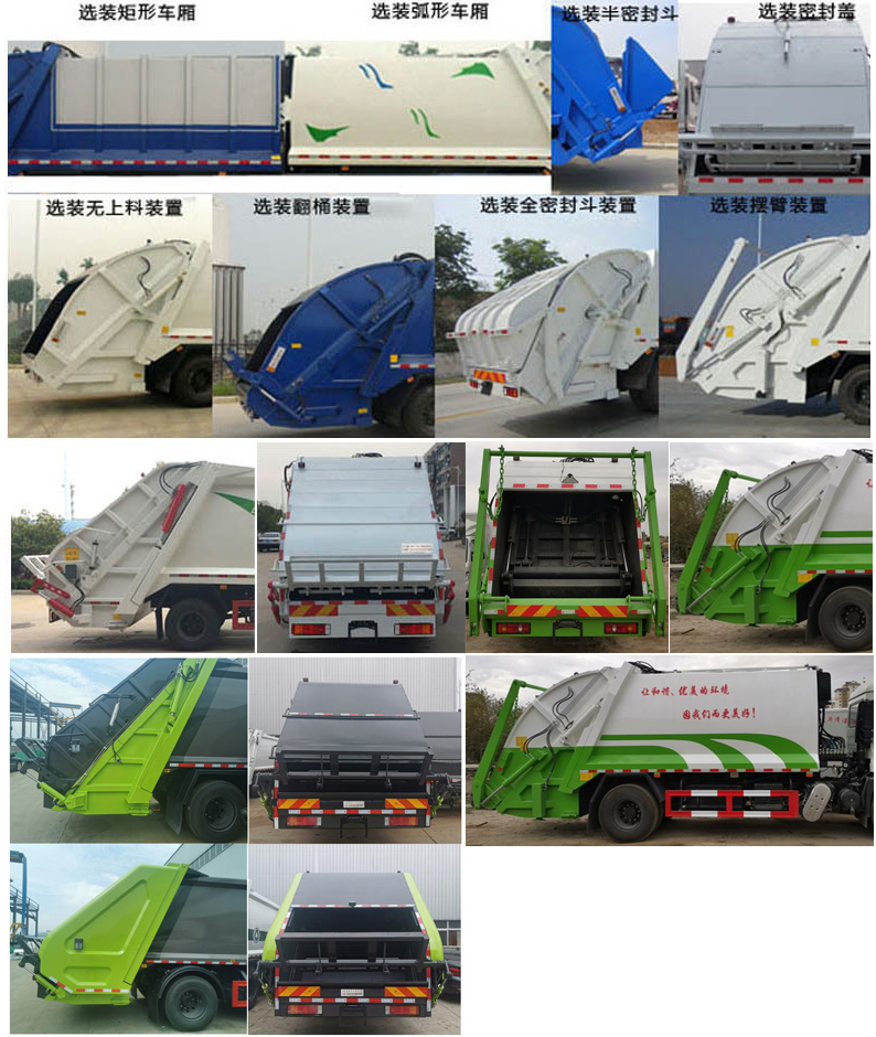 其它 | 1、該車主要專用裝置由箱體、壓縮系統(tǒng)組成,用于垃圾的收集與清運(yùn)。該車可選裝方形或弧形箱體,選裝全密封蓋裝置,選裝方形擋泥板,選裝側(cè)防護(hù)連接結(jié)構(gòu)件,選裝側(cè)防護(hù)樣式。選裝后部工作裝置。選裝多路閥位置,液壓油箱位置。選裝爬梯樣式;選裝工作裝置時(shí)外形長(zhǎng)/前懸/軸距/后伸對(duì)應(yīng)關(guān)系為(mm):①無(wú)上料裝置:8680/1400/4500/-,8710/1430/4500/-,8880/1400/4700/-,8910/1430/4700/- ;②全密封斗裝置和擺臂裝置:8880/1400/4500/200,8910/1430/4500/200,9080/1400/4700/200,9110/1430/4700/200;③翻桶裝置和翻斗裝置:9080/1400/4500/400,9110/1430/4500/400,9280/1400/4700/400,9310/1430/4700/400。僅采用4500mm,4700mm軸距。2、側(cè)防護(hù)采用冷彎型鋼/Q235,螺栓連接;后防護(hù)由專用裝置替代,下邊緣離地高:500mm。3、隨底盤(pán)選裝選裝高度不同的駕駛室;選裝前霧燈;選裝駕駛室頂部裝飾燈;選裝駕駛室前面罩;選裝前保險(xiǎn)杠及前部燈具,選裝后視鏡;選裝后部燈具;選裝駕駛室前臉擾流罩;駕駛室臥鋪側(cè)窗選裝裝飾板,選裝后背式排氣管。安裝帶有衛(wèi)星定位功能的行駛記錄儀。ABS型號(hào)/生產(chǎn)廠家:3631010-C2000/東科克諾爾商用車制動(dòng)系統(tǒng)(十堰)有限公司,ABS 8/東科克諾爾商用車制動(dòng)系統(tǒng)(十堰)有限公司, 4460046450/威伯科汽車控制系統(tǒng)(中國(guó))有限公司,J ABS/焦作博瑞克控制技術(shù)有限公司。采用的發(fā)動(dòng)機(jī)與油耗值對(duì)應(yīng)關(guān)系為(L/100Km):DDi50E190-60/23.9,D4.5NS6B190/24.4,D6.7NS6B230/23.7,B6.2NS6B210/23.8,B6.2NS6B230/23.8。隨底盤(pán)選裝油箱位置。選裝箱體樣式,填裝器樣式。隨底盤(pán)選裝后處理、電瓶、尿素罐、備胎安裝位置。選裝油管布局. | ||